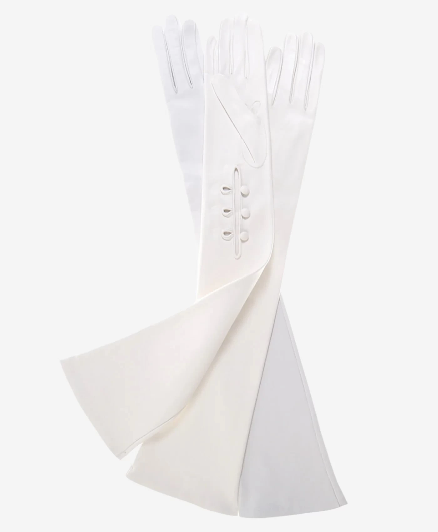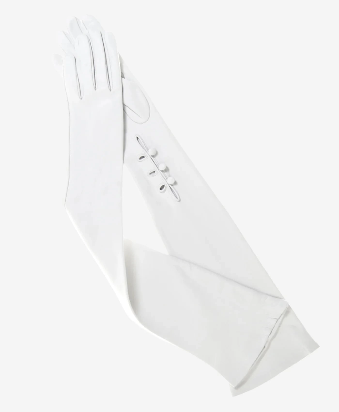 Timeless style: Crafted in pure ivory and styled in the classic 12-button opera length, with a traditional mousquetaire three-button wrist closure. These gloves extend just beyond the elbow for a dramatic and refined look.