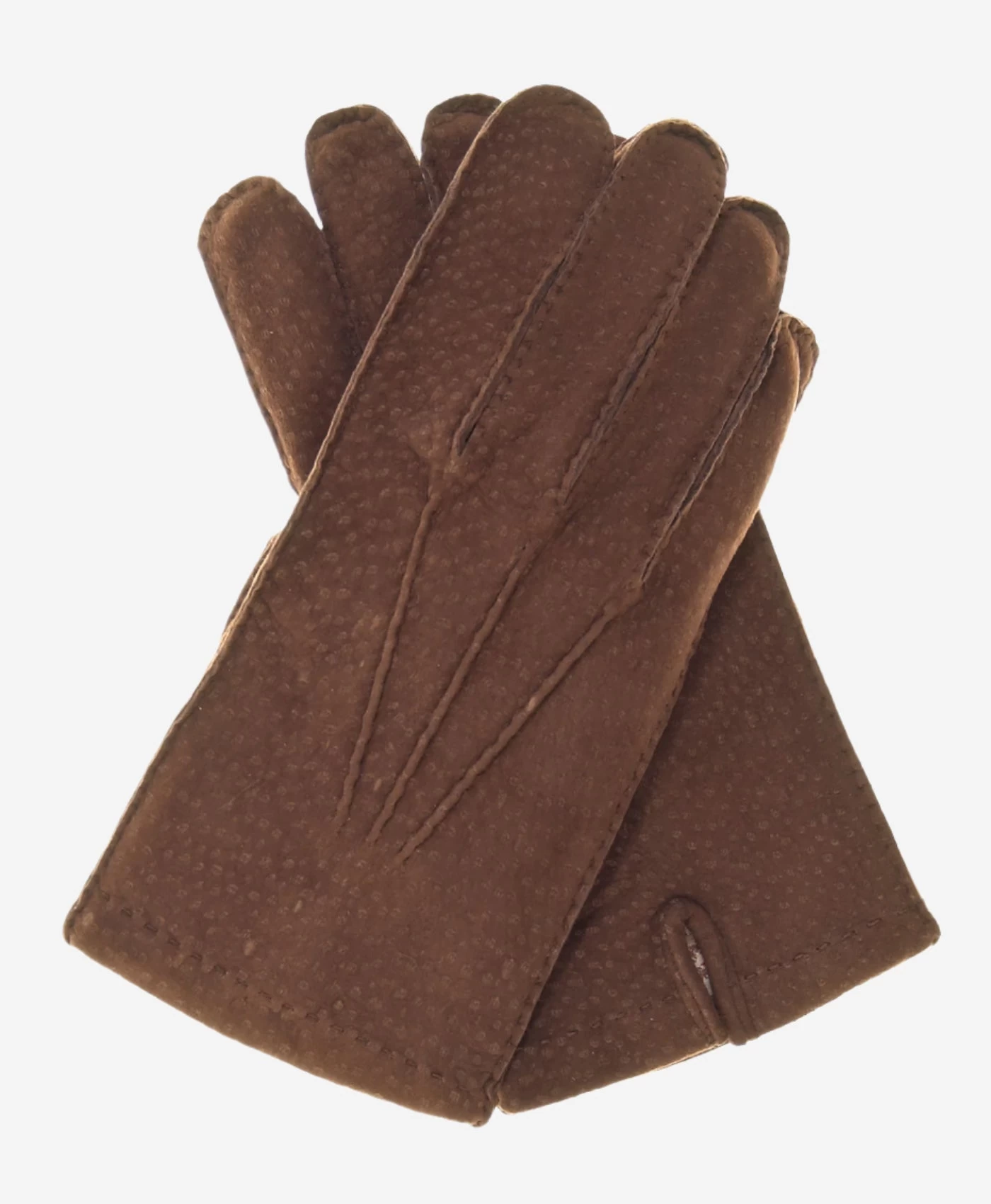 These handsewn cashmere lined carpincho dress gloves are exotic while also being very elegant; so exotic you might want to put them in a display case rather than wear them. But don’t! Made from the carpincho hide an animal found in the South American capybara, it is related to peccary but much rarer. These wonderful buttery soft gloves are offered in the two distinct colors of coffee and grey that display and highlight the natural carpincho grain. Lined in 100% Italian cashmere, you won’t find a more exotic pair of dress gloves!