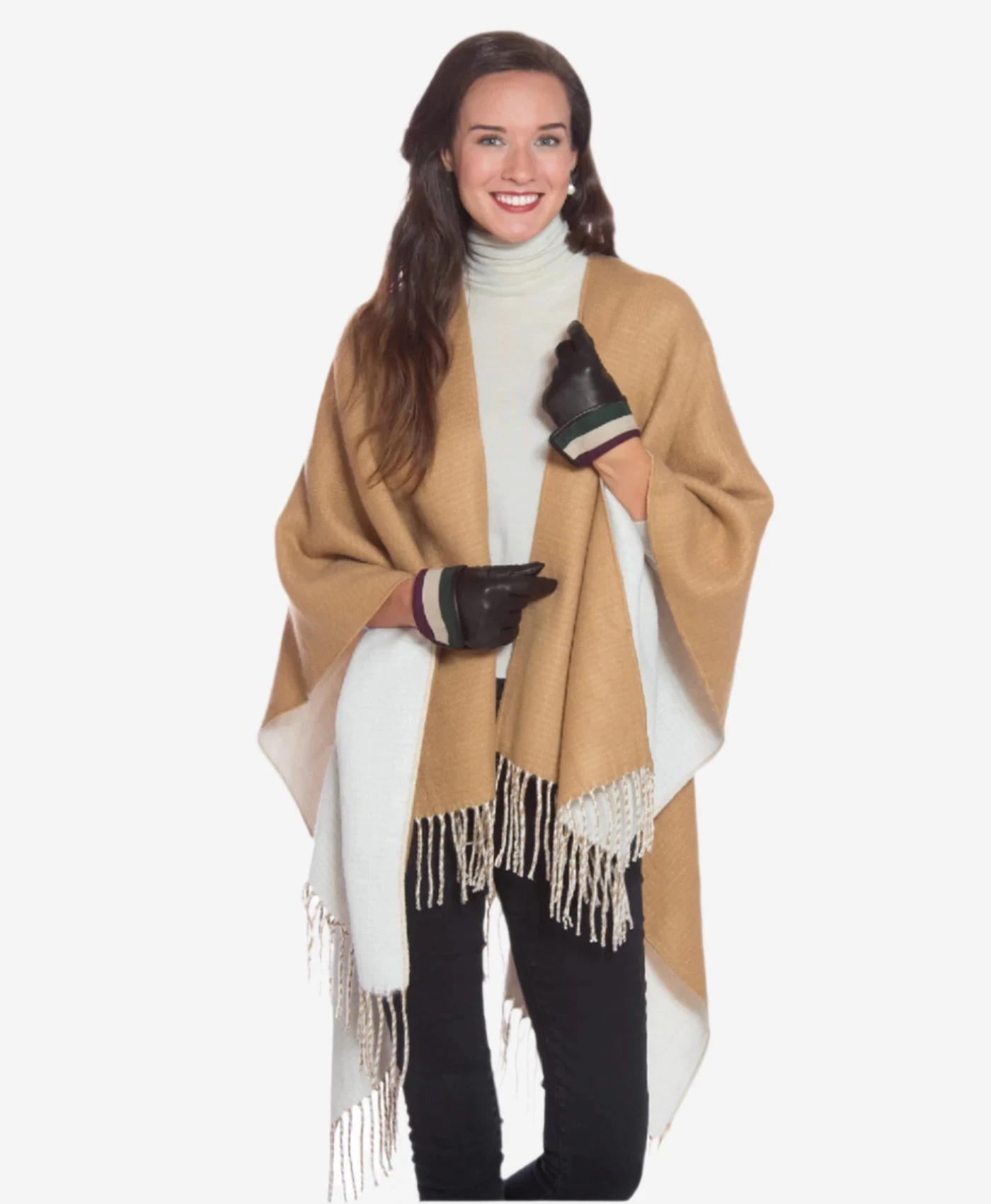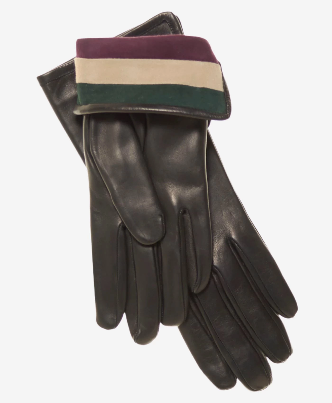 These Italian imported gloves from Fratelli Orsini combine the beautiful sleek look of a traditional 3 button length dress glove with a contrasting 3 color suede fold over cuff. Folded over, the inner 3 colors of burgundy, cream and green make a distinctive fashion statement displaying the exquisite workmanship of the artisans at Fratelli Orsini. Lined in 100% Italian cashmere, these luxurious gloves will keep your hands looking and feeling great during the cold winter months.