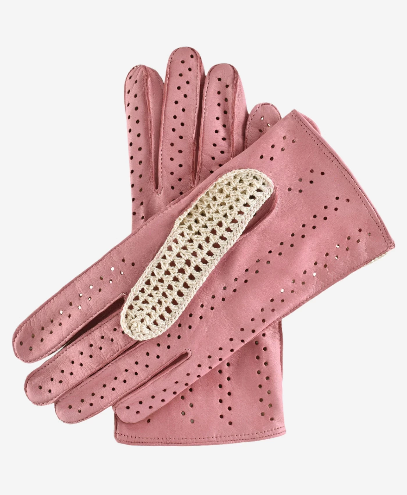 Style: Inspired by classic racing, the Valeria crochet driving gloves are a stylish and practical choice for summer. Featuring a beautiful combination of cognac lambskin leather and hand-sewn beige crochet from organic cotton, these gloves are designed to provide both elegance and comfort.