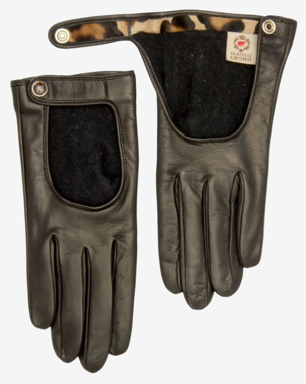 Understated luxury is the design model for these unusual Italian leather driving gloves by the artisans at Fratelli Orsini. Made of the finest lambskin, these lambskin driving gloves are distinguished by an incredibly soft and warm black knitted cashmere lining, and feature a hidden accent of leopard-print pony (haircalf) on the inside of the wristband. It’s a detail you’ll enjoy every time you put on the gloves, but only you’ll know about the bling inside.
