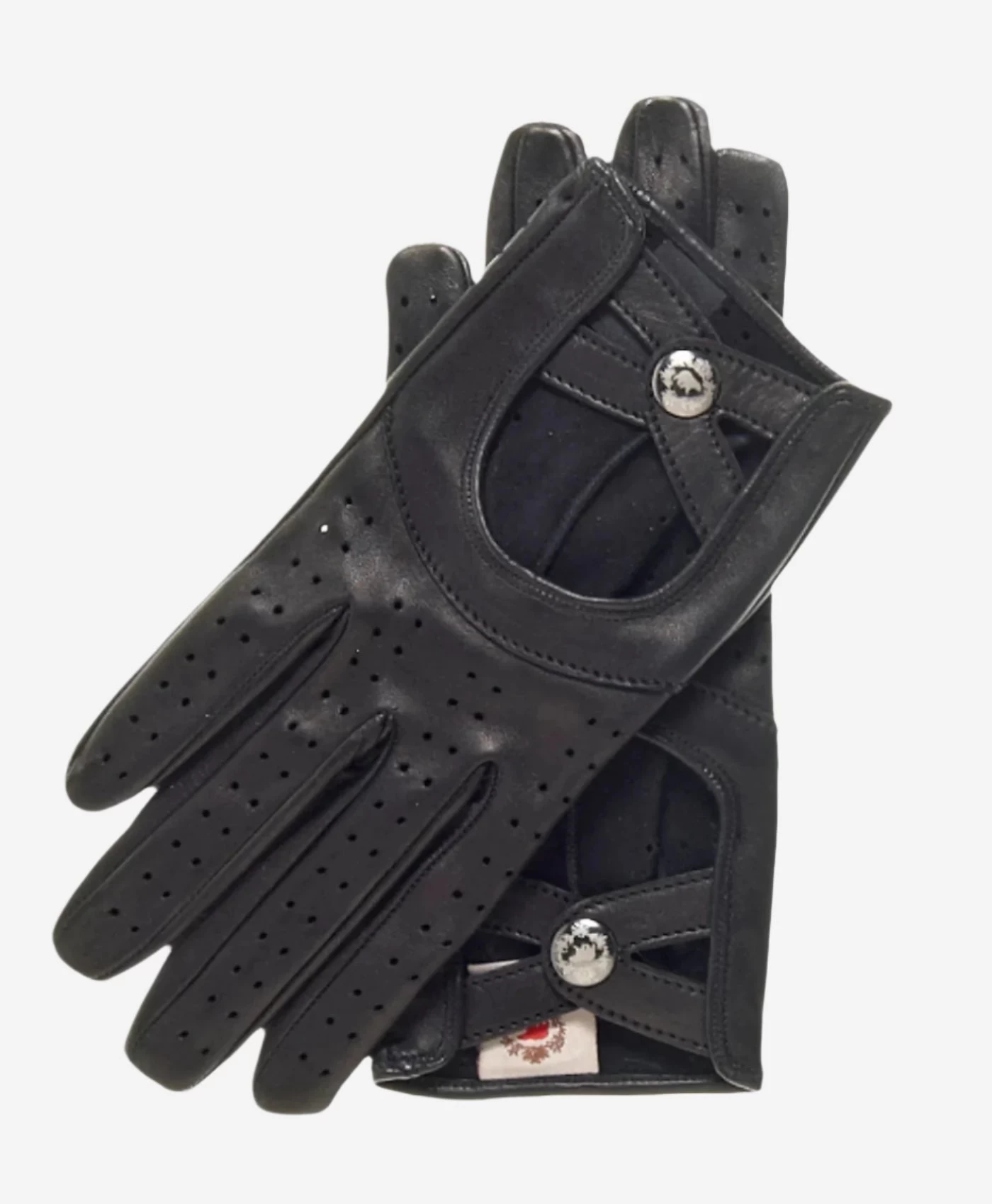 A unique variation on traditional driving gloves for women, these fine lambskin leather driving gloves feature a “criss-cross” strap on the back of the hand highlighted with the Fratelli Orsini bear insignia snap closure. With air-cooling ventilation holes throughout the palm and back side.