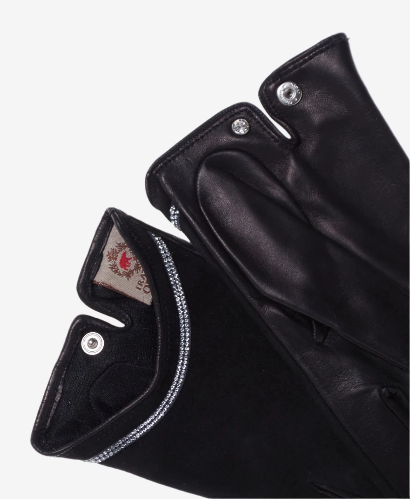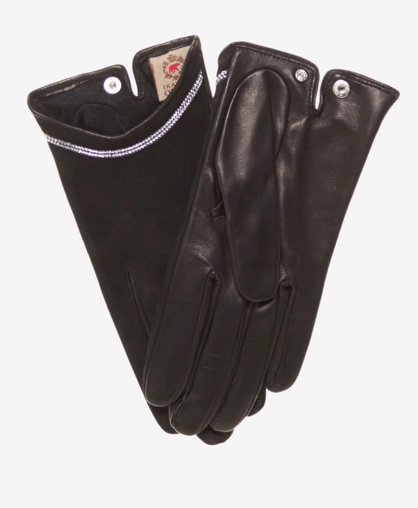 Our designers at Fratelli Orsini have created a subtle and elegant new look with a double band of genuine Swarovski crystal at the wrist of these fine Italian lambskin gloves. The back of the glove is sueded lambskin with a curved hem while the palm side is smooth lambskin. These gloves are lined in 100% pure Italian Silk, demonstrating all the care and finish you expect from the artisans at Fratelli Orsini.