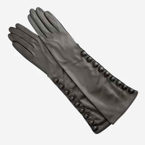 These amazing women’s elbow-length leather dress gloves (also known as 8-button length) are inspired by the elegant look of high fashion in the early 1900s. Functional leather-covered buttons are placed at the wrist and all the way up the arm to the elbow, a stunning vintage look that creates a perfect fit. With a shell of fine lambskin leather and a lining of the best Italian silk, the designer artisans at Fratelli Orsini in Italy have outdone themselves with these incredible long leather gloves, a rare treat and perfect accessory for that special dress occasion.