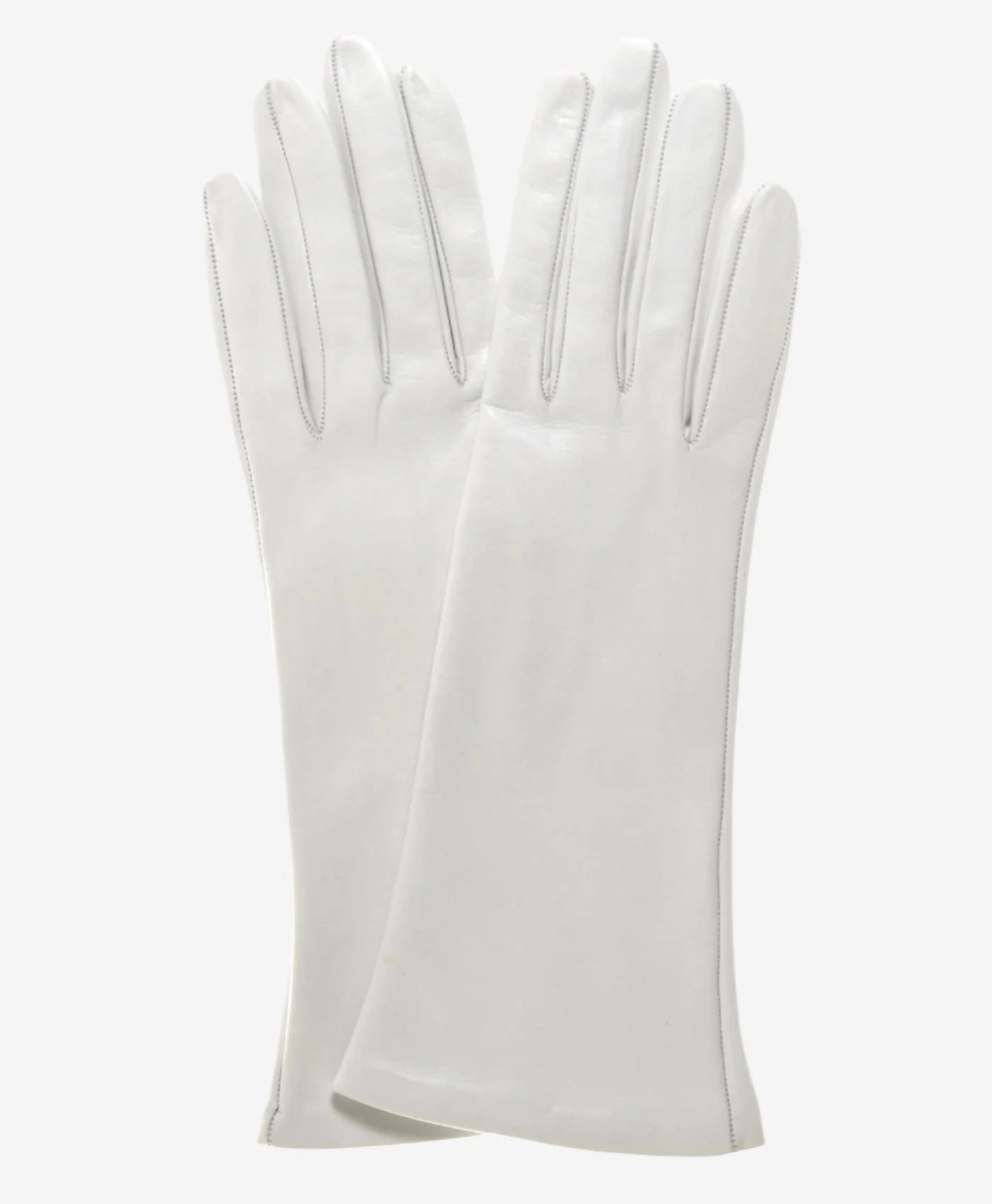 Ideal for weddings and debutantes, these 100% Italian Silk Lined pure white lambskin leather gloves are as simple and elegant as you can get. These four button length gloves (approximately 4 inches beyond the wrist) are neither long nor short, just the right length to accent a 3/4 length sleeve.