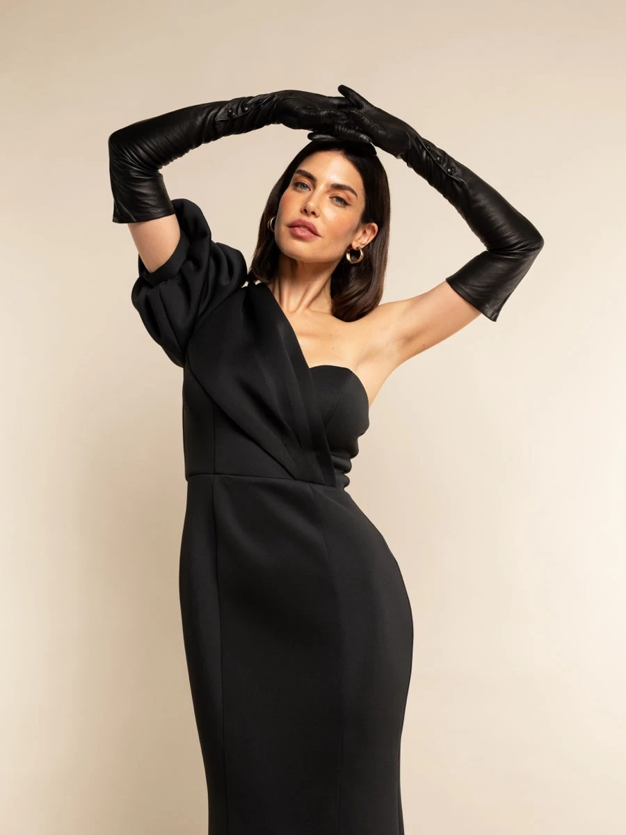 Dramatic elegance: Designed to extend beyond the elbow and nearly reach the shoulder, they offer a striking silhouette that exudes timeless sophistication.