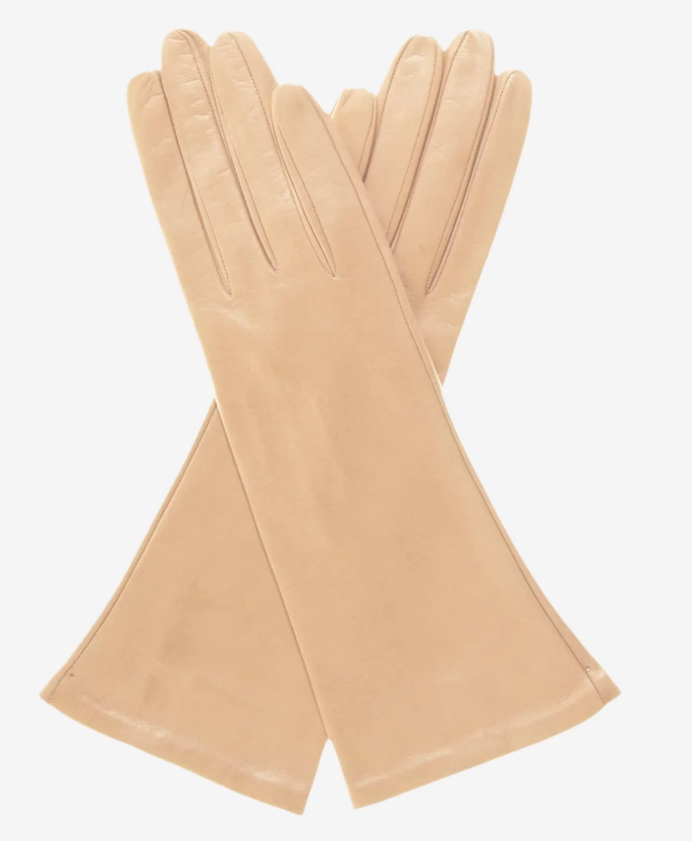 These long leather gloves for women are the perfect accessory for a special evening at a formal event or just a night on the town. There are no buttons or decorative details, just a silky smooth classic style of the absolute highest quality. The exceptional Italian glovemakers at Fratelli Orsini have included a beautiful white silk lining to complement the shell, which is a black, brown, red or white leather of fine Italian lambskin. The four-button length extends up the arm and comes to rest between the wrist and elbow.