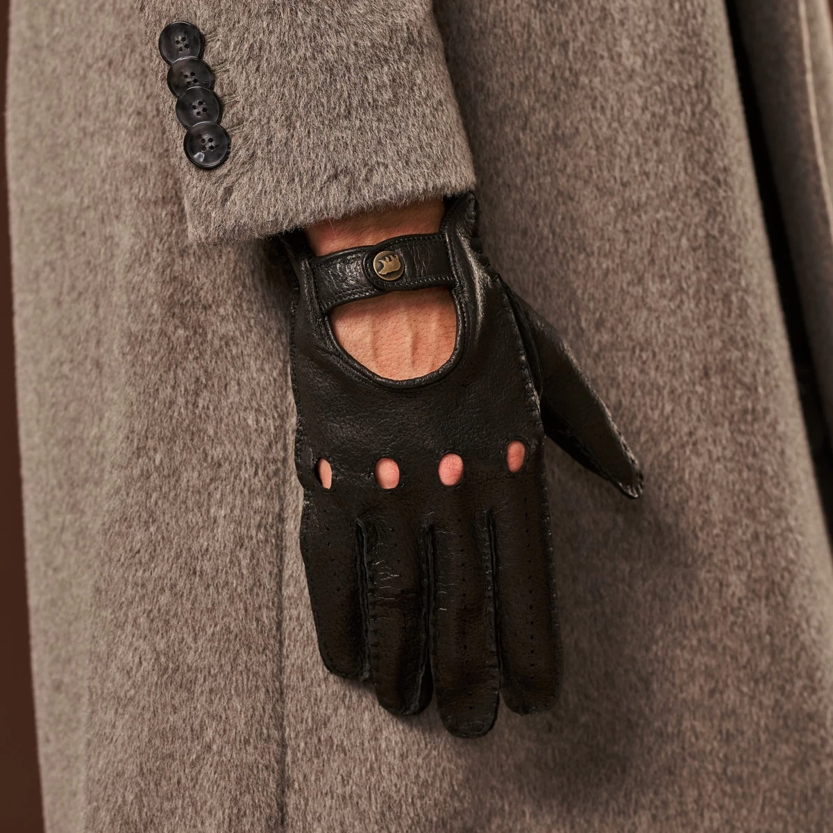 Wrist: The gloves are fitted with a snap-button closure at the wrist, ensuring a secure and snug fit. This sleek design keeps the gloves firmly in place while adding a refined touch to the overall look.