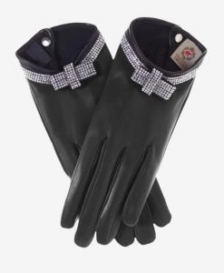 FS4321 (black) – Women’s Italian Silk Lined Leather Gloves With Swarovski Crystal Bow