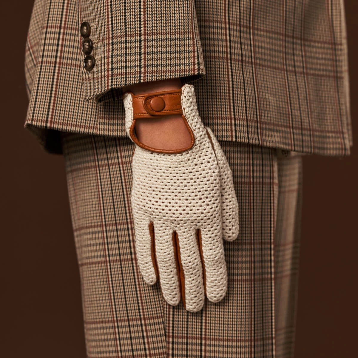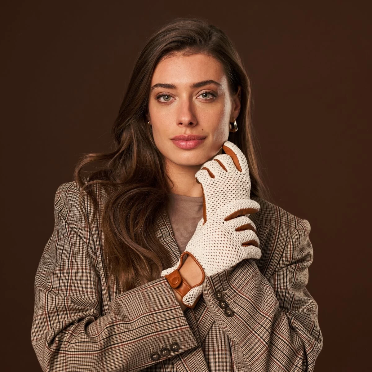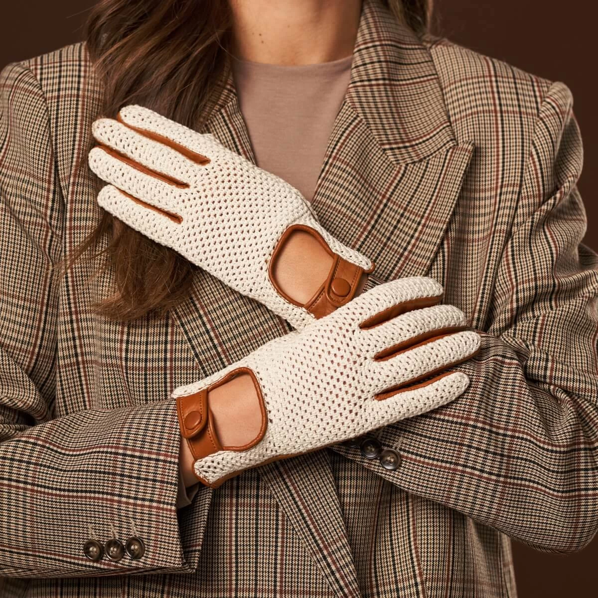 Style: Inspired by classic racing, the Valeria crochet driving gloves are a stylish and practical choice for summer. Featuring a beautiful combination of cognac lambskin leather and hand-sewn beige crochet from organic cotton, these gloves are designed to provide both elegance and comfort.